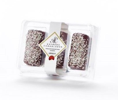Vaniljeskum på marcipanbunde overtrukket med mørk chokolade og kokos.