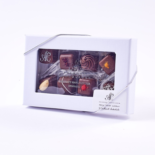 Vores chokoladeæske uden tilsat sukker indeholder mørk chokolade, marcipan og sødestof, for at give den ønskede smag.